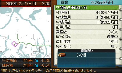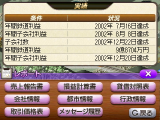 ・1年目にクリア条件の内で最も厳しかった鉄道利益10億円を②の資源だけで達成できるか不透明です。そちらで駄目だった場合は2年目以降に貯金や子会社利益、株などを元手に線路を新設し、隣町間輸送で鉄道利益を達成する予定