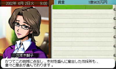 前回桜鋸営林署(湖付近)に建てて活用した資材工場Aですが、こちらは会話シーンで新設等に言及されておらず、伐採所2個分の子会社利益を稼ぎ出すなど強力だったため封じます