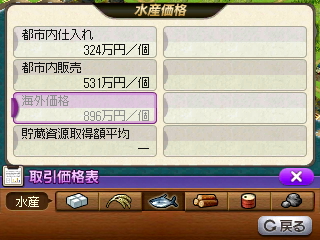 ・農水産はマップ西の離れ島サントス村から機関車で一日二便、4×2=8個分を運搬。畑は数マスしか存在していませんが、こう見えても農業組合所一つにつき一日5個程度生産してくれます